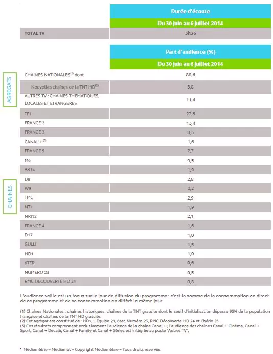 Du 30 juin au 6 juillet 2014 la durée d’écoute est de 3h36. Les chaînes nationales (1) y compris les chaînes TNT comptabilisent 88.2 % de part d’audience alors que les autres réunissent 11.’%. TF1 arrive largement en tête avec 27,5% suivi de France 2 (13.4%) et de M6 (9.5%) qui arrive juste devant France 3 (8.3%). En queue de peloton des chaînes TNT on retrouve 6TER (0.6%) et NUMERO 23 avec 0.5% de part d’audience.