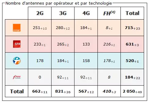 4) FH (faisceau hertzien) : Système de transmission entre les antennes relais. N’est jamais directement capté par un mobile. (chiffre non comptabilisé dans le total des antennes).
