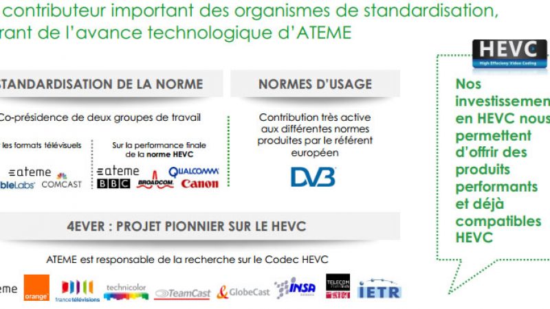 Ateme a de l’ambition et veut déployer HEVC à grande échelle. Lors de la récente levée de fond d’Ateme, Michel Artières, son PDG, avait déclaré : "Aujourd’hui Ateme a une avance technologique sur HEVC et on veut se donner les moyens de se tailler la part du lion dans ce marché qui pourrait représenter 40% du marché de la compression vidéo en 2018"