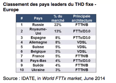 Concernant le nombre d’abonnés dans le monde, toutes technologies THD confondues, la France se classe 7ème, avec plus de 2 millions d’abonnés. Ce sont les Etats-Unis qui prennent la tête du classement avec 62.5 millions d’abonnés fin 2013. Ils sont suivis par la Chine (42.4 millions) et le Japon (27 millions).