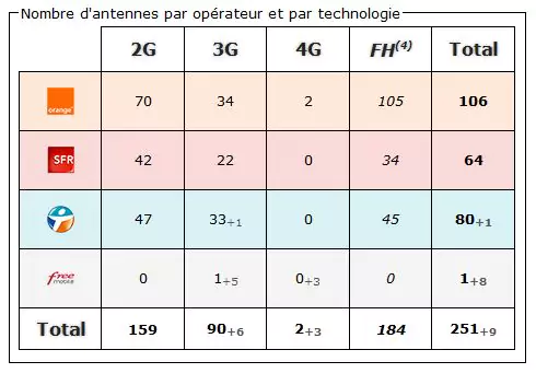 4) FH (faisceau hertzien) : Système de transmission entre les antennes relais. N’est jamais directement capté par un mobile. (chiffre non comptabilisé dans le total des antennes).
