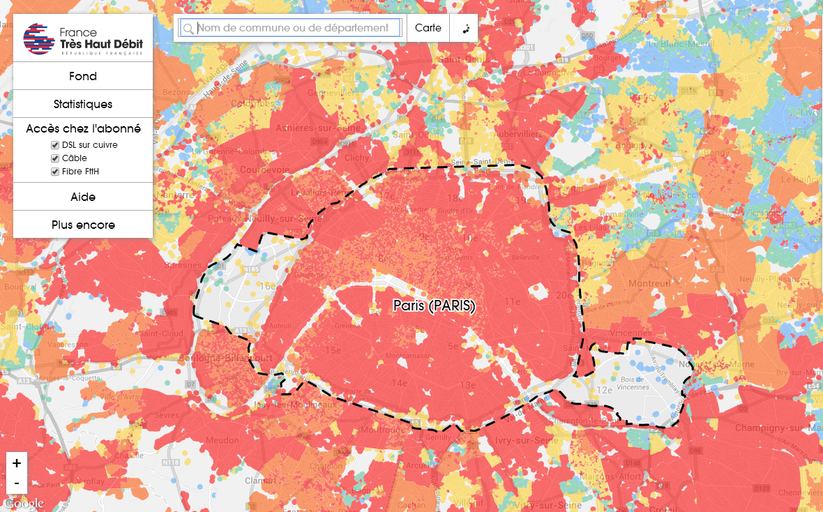 Cet outil, qui n’est pas un test d’éligibilité, permet de découvrir par commune et département les tranche de débits atteignables par zone et par technologie ( DSL, câble ou FTTH). Seuls les débits descendants sont pris en compte et cet outil ne fait pas de distinction entre les opérateurs. Ces débits théoriques sont néanmoins calculés à partir des données communiquées par les opérateurs de réseaux et ne prend en compte que la valeur maximum théorique annoncée par les différents FAI.