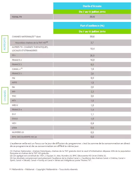 Du 7 au 13 juillet 2014 la durée d’écoute est de 3h36. Les chaînes nationales (1) y compris les chaînes TNT comptabilisent 89.6 % de part d’audience alors que les autres réunissent 10.4%. TF1 arrive largement en tête avec 26% suivi de France 2 (16%) et de France3 (9.5%) qui arrive juste devant M6 (9%). En queue de peloton des chaînes TNT on retrouve 6TER (0.6%) et NUMERO 23 avec 0.5% de part d’audience.