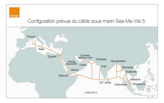 Orange souhaite renforcer sa présence sur l’axe Asie Europe et a annoncé hier la construction d’un nouveau câble sous-marin le Sea Me-We 5 reliant la France à Singapour. Il reliera ainsi la France, l’Italie, l’Egypte, l’Arabie Saoudite, Djibouti, le Yémen, les Emirats Arabes Unis, Oman, le Pakistan, l’Inde, le Sri Lanka, le Bangladesh, la Birmanie, la Thaïlande, la Malaisie, l’Indonésie et Singapour.