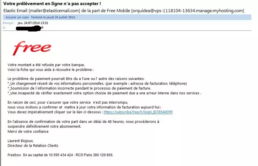Beaucoup d’autres façons permettent de différencier un vrai mail de Free d’un faux, la plus évidente sur celui-ci est que le directeur de la relation abonné de Free ne s’appelle pas Laurent Biojoux, mais c’est une directrice et elle s’appelle Angélique Berge