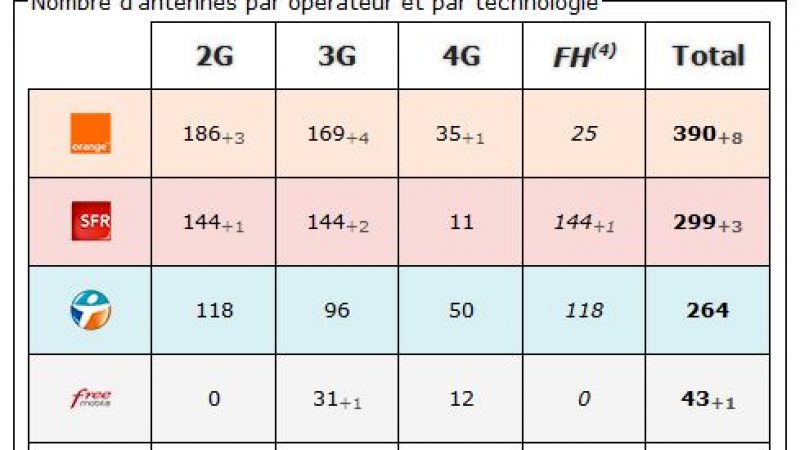 4) FH (faisceau hertzien) : Système de transmission entre les antennes relais. N’est jamais directement capté par un mobile. (chiffre non comptabilisé dans le total des antennes).