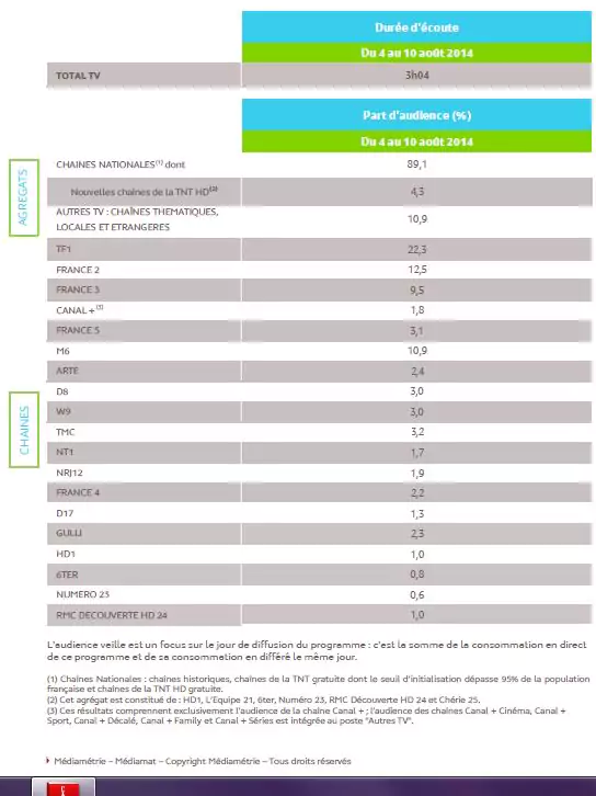 Du 4 au 10 août 2014 la durée d’écoute est de 3h04. Les chaînes nationales (1) y compris les chaînes TNT comptabilisent 89.1 % de part d’audience alors que les autres réunissent 10.9.’%. TF1 arrive largement en tête avec 22,3% suivi de France 2 (12.5%) et de M6 (10.9%) qui arrive juste devant France 3 (9.5%). En queue de peloton des chaînes TNT on retrouve 6TER (0.8%) et NUMERO 23 avec 0.6% de part d’audience.