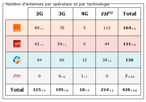4) FH (faisceau hertzien) : Système de transmission entre les antennes relais. N’est jamais directement capté par un mobile. (chiffre non comptabilisé dans le total des antennes).