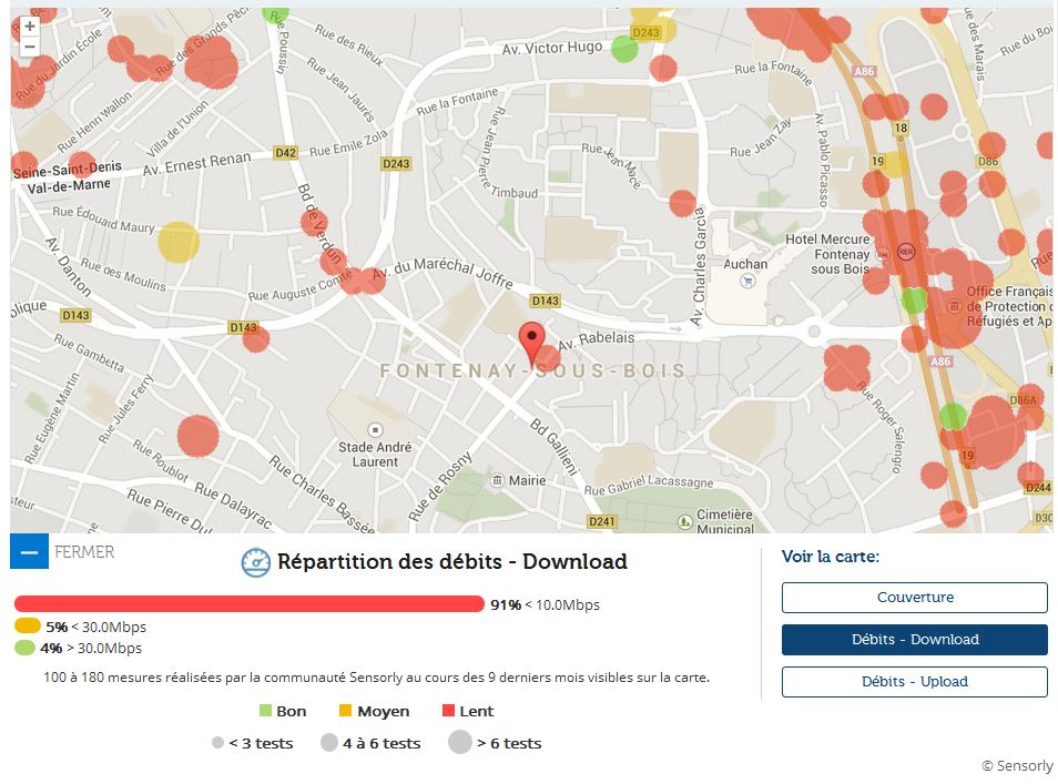 Avec les données de notre partenaire Sensorly Univers Freebox vous propose un focus sur Fontenay-Sous-Bois 110ème ville de France par sa population et vous fait découvrir la carte de la couverture du réseau 4G et des débits.
