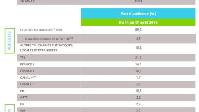 L’audience de la télévision du 11 au 17 août 2014