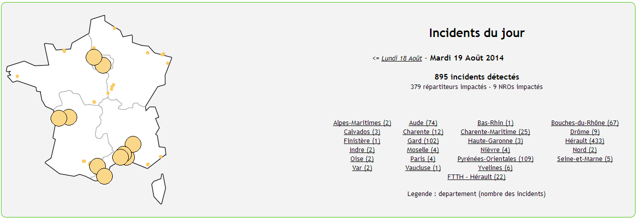 Pourtant cette nuit tous les indicateurs se sont affolés avec pas moins de 895 incidents détectés sur 379 répartiteurs et 9 NROs. L’Hérault, les Pyrénées Orientales et le Gard ont été les départements les plus touchés parmi les 17 départements touchés.