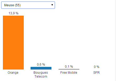 Si Orange dispose d’un minimum de couverture dans chaque département (à part la Creuse), Bouygues affiche moins de 1% de couverture de la population dans 5 départements. Pour SFR ce sont 39 département qui ne bénéficient pas d’au moins 1 % de la population du département couverte, contre 34 départements pour Free Mobile.