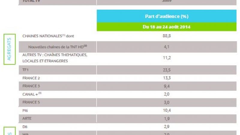 Du 18 au 24 août 2014 la durée d’écoute est de 3h09. Les chaînes nationales (1) y compris les chaînes TNT comptabilisent 88.8 % de part d’audience alors que les autres réunissent 11.2.’%. TF1 arrive largement en tête avec 23,5% suivi de France 2 (13.3%) et de M6 (10.4%) qui arrive juste devant France 3 (9.4%). En queue de peloton des chaînes TNT on retrouve 6TER (0.8%) et NUMERO 23 avec 0.6% de part d’audience.
