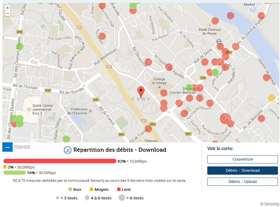 Avec les données de notre partenaire Sensorly Univers Freebox vous propose un focus sur Evry 115 ème ville de France par sa population et vous fait découvrir la carte de la couverture du réseau 4G et des débits.