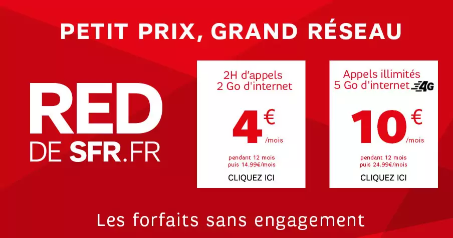 LE FORFAIT RED Appels illimités + 5 Go d’internet en 4G sans engagement pour 10€/mois pendant 12 mois (au lieu de 24,99€/mois) 2 :