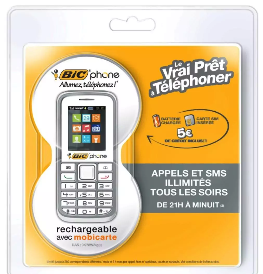 Ce nouveau BICphone est proposé au prix public de 24,90 €TTC avec 5 € de crédit inclus (soit 12 minutes de communication en métropole vers tous les opérateurs) valable dès l’achat, et 100 SMS offerts après l’identification de la ligne. Cette nouvelle version du BICphone permet également au client de bénéficier d’appels et SMS illimités tous les soirs de 21h à minuit. Une fois le crédit inclus épuisé, le client recharge son mobile BICphone en choisissant l’une des recharges de la gamme mobicarte Orange.