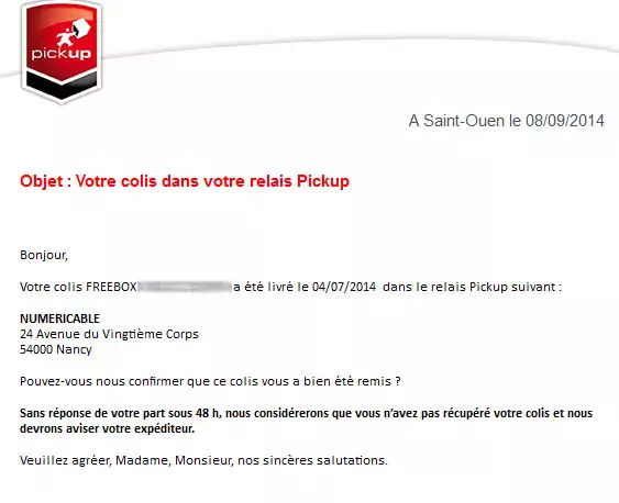 Cette situation devient cependant plus cocasse quand les abonnés Free doivent aller chercher leur colis Freebox chez Numéricable, ainsi que la montre le mail ci-dessous que nous a transmis un abonné un peu étonné.