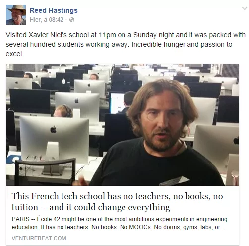 C’est a à travers un "post sur son mur" Facebook que le PDG de Netflix a révélé avoir visité "l’école de Xavier Niel" un dimanche soir à 11h et avoir été "emballé par les centaines d’étudiants entrain de travailler avec une incroyable passion et faim de réussir".