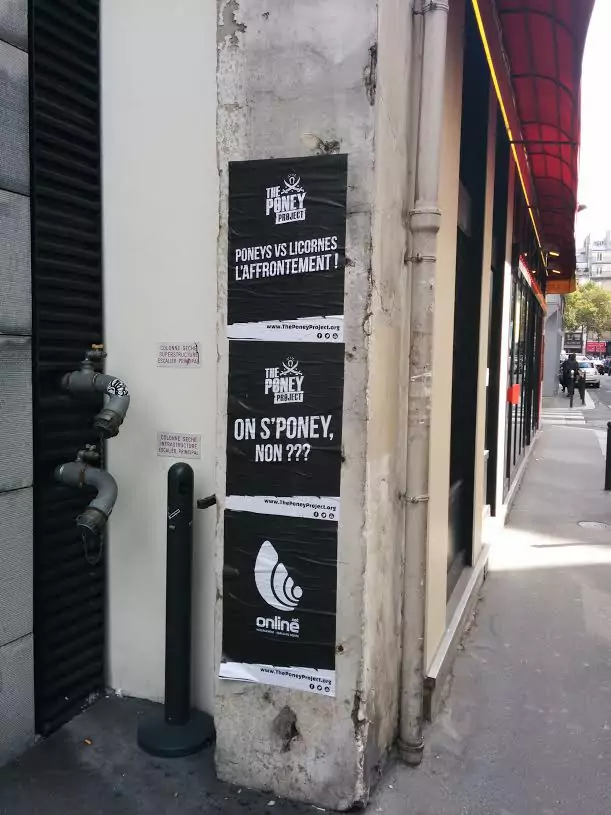 C’est le 25 septembre prochain, au cours d’une soirée organisée dans un lieu tenu secret, que sera révélé« The Poney Project ». Et si les organisateurs de ce buzz ne se dévoilaient pas complètement jusqu’alors, ou uniquement sous leurs pseudos issus d’équidés plus ou moins célèbres, il est maintenant indiqué « Online.net » sur la communication. C’est ce qu’ont pu constater ce matin des salariés de Free, sur des affiches ou encore des pochoirs, déposés rue de la Ville L’Evêque, devant le siège d’Iliad. C’est donc bien la filiale hébergement d’Iliad qui annoncera ce qu’est son projet le 25 septembre.