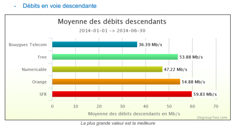 Concernant le débit descendant relevé en très haut débit fixe selon les opérateurs, le débit moyen descendant relevé avec Free est de 53,88 Mb/s. Il se situe à la troisième place du podium derrière SFR (59,833 Mb/s) et Orange (54,88 Mb/s) mais devant les deux opérateurs utilisant pour tout ou une partie de leurs connexions THD le technologie coaxiale (FTTLA) soit Numericable (47,22) et Bouygues Télécom (36,39 Mb/s). Tous les opérateurs sauf le leader SFR voient leur débit moyen constaté chez les abonnés augmenter.