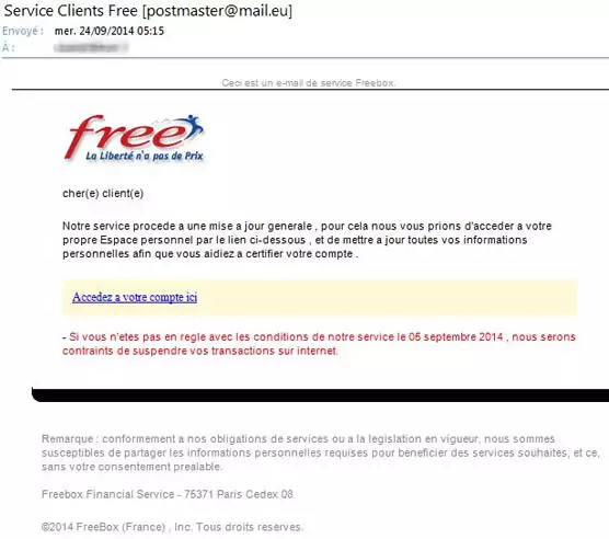 Pour être certain de ne pas vous faire pirater vos informations suite à ce type de fraude, ne cliquez jamais sur le lien dans le mail, mais rendez-vous directement sur votre espace abonné depuis free.fr. Si Free avait un message à vous faire passer, il serait affiché sur votre espace abonné.