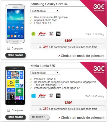 En revanche, attention aux offres de 30 € concernant les Samsung Galaxy Core 4G et Nokia Lumia 625. Ces dernières ont expiré le 30 septembre.