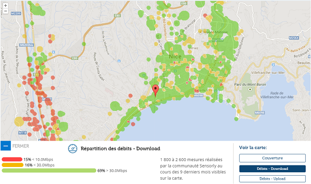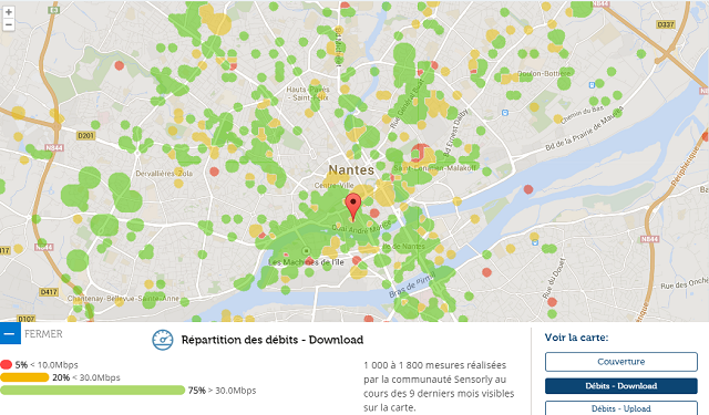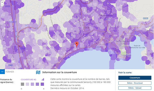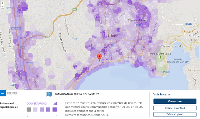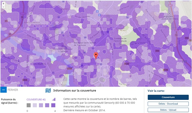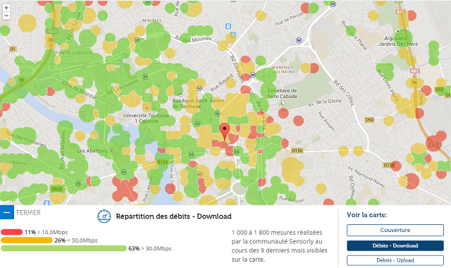 Avec l’application Sensorly, les utilisateurs de l’application peuvent ainsi retrouver sur des cartes précises selon l’opérateur, l’état de la couverture réelle et les débits obtenus par les utilisateurs. Des niveaux de zoom différents permettent ainsi aux abonnés de connaître les débits relevés dans leur rue, leur quartier, leur ville. En effet, chaque ville est découpée en milliers de micro-zones qui sont par la suite agrégées pour construire les histogrammes. L’intérêt de cette méthode est qu’un utilisateur effectuant plusieurs tests dans une de ces micro-zones n’aura d’influence que dans celle-ci.