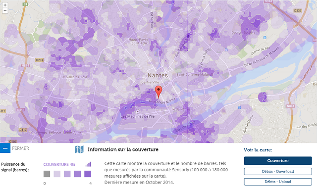 En terme de couverture, Bouygues dispose toujours de la puissance de signal reçu en 4G la plus forte et la plus large. A Nantes, SFR et Orange sont néanmoins plus proche de Bouygues sur le volet couverture. Free présente une nouvelle fois une carte de couverture avec un signal de réception plus faible que ses concurrents.