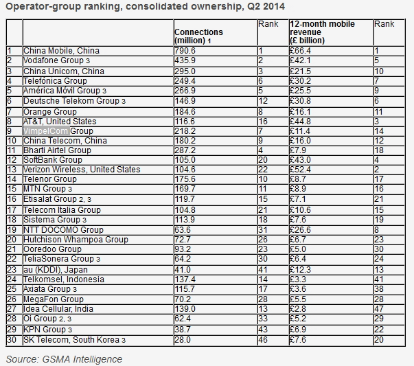 Le classement mondial des opérateurs mobile au 2e trimestre 2014, a été publié par la GSMA Intelligence, la partie étude de l’association mondiale de l’industrie mobile.