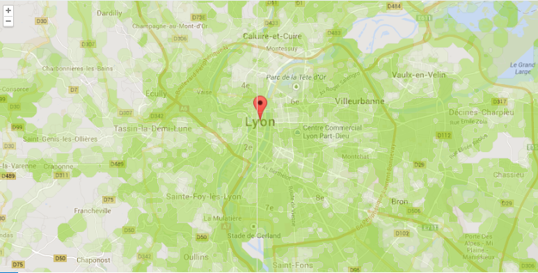 Sur l’agglomération de Lyon, 106 antennes sont déclarées actives, mais à l’arrivée si la puissance du signal est au rendez vous sur la majorité de l’agglomération. La deuxième ville de France est, elle aussi, confrontée à de petites zones sans traces de couvertures par le réseau propre de Free Mobile.