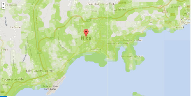 La couverture de Nice est plus compliquée. Avec 52 antennes sur Nice et ses alentours, si le littoral présente un fort niveau de couverture, les quartiers de la Costière, Saint Pierre de Féric et les alentours immédiats de l’université Sophia-Antipolis sont globalement contraints à l’itinérance Orange.