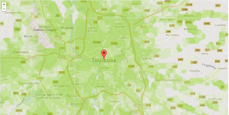 Toulouse est également plutôt bien couvert, avec 71 antennes Free Mobile déclarées actives en 3G sur l’agglomération. Le nord de Toulouse affiche une puissance du signal reçue très forte, légèrement plus faible au sud de Toulouse.