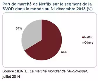 Hors marché US, Netflix est désormais présent dans 46 pays en octobre 2014, pour 13.8 millions d’abonnés à l’international. À lui seul, ce service concentre les deux tiers des abonnés à une offre de télévision à la demande par abonnement dans le monde. A titre de comparaison, HBO est présent dans 61 pays répartis entre l’Amérique latine, l’Asie et l’Europe rassemblant plus de 35 millions d’abonnés, dont une part croissante accède au service HBO Go.