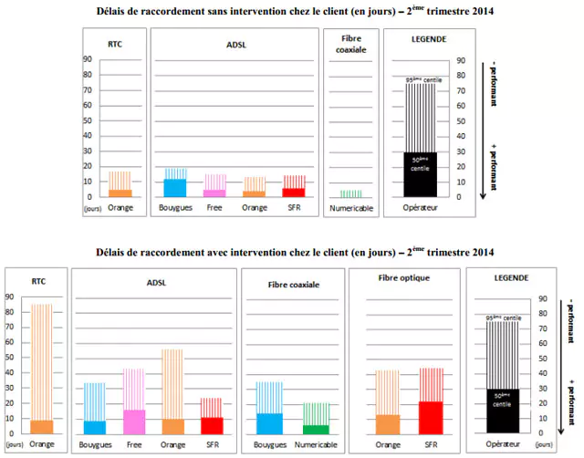 L’histogramme plein représente le 50ème centile des délais de raccordement, c’est-à-dire le délai en deçà duquel sont activés 50% des raccordements les plus rapides.