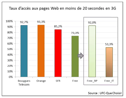 Par contre, concernant la rapidité d’envoi de ces fichiers, "le taux de fichiers de 1 Mo envoyés en moins de 30 secondes en 3G" sur l’itinérance d’Orange est la performance la plus faible (75%) quand Free Mobile sur son réseau propre dispose des meilleures performances devant même Orange (91,7%). Ce grand écart des performances étant imposé aux abonnés Free Mobile, il se retrouve tous réseaux confondus avec un taux de 83,3 % de fichiers de 1 Mo envoyés en moins de 30 secondes. Des résultats néanmoins supérieurs à Bouygues Telecom et SFR.