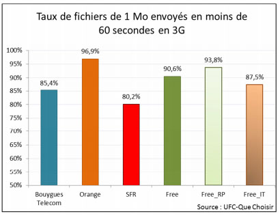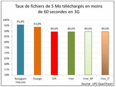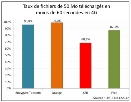 En retenant un critère de temps de 60 secondes pour réaliser le téléchargement d’un fichier de 5 Mo, l’UFC-Que Chosir metr constate des différences de performances relativement peu marquées. Les réseaux de Bouygues Telecom et d’Orange se démarquent en étant les seuls à permettre le téléchargement du fichier en moins de 60 secondes dans plus de 9 cas sur 10. SFR et Free Mobile sont en-dessous de ce seuil et nous remarquons une performance identique sur le réseau propre de Free et sur l’itinérance.