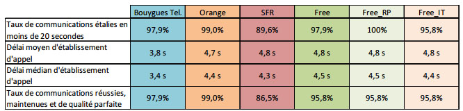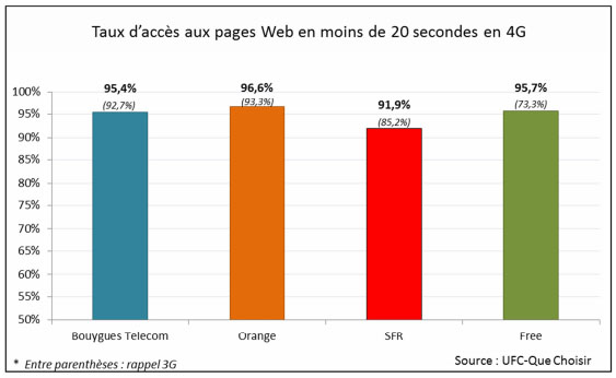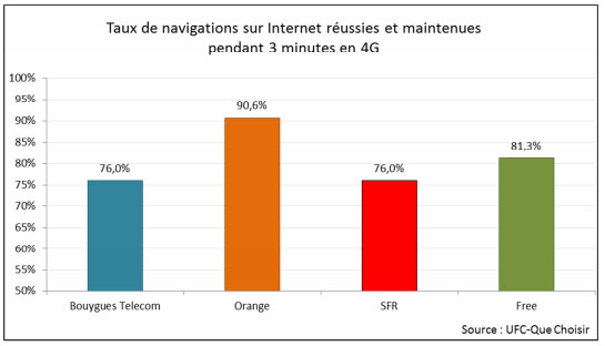 Les résultats sur la 3G indiquent des différences importantes sur les qualités de service proposées par les quatre opérateurs de réseau. Orange tire clairement son épingle du jeu (taux de qualité de 87,6%), devant Bouygues Telecom (83,3%). SFR (76,4%) monte sur la troisième marche du podium en montrant régulièrement des signes de faiblesses particulièrement marqués. Free Mobile (65,0%) offre la qualité de service la plus faible.