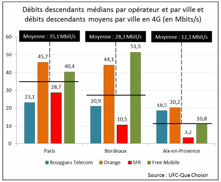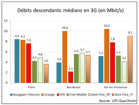 Le débit descendant (en téléchargement) médian est de 9,6 Mbit/s pour Orange, 7,2 Mbit/s pour Bouygues Telecom, 6,3 Mbit/s pour SFR, et 4,8 Mbit/s pour Free Mobile (4,8 Mbit/s sur son réseau propre et 4,2 pour l’itinérance). Encore une fois, on notera que les débits réels sont bien moindre que les débits théoriques en 3G annoncés par les opérateurs (jusqu’à 42 Mbit/s).