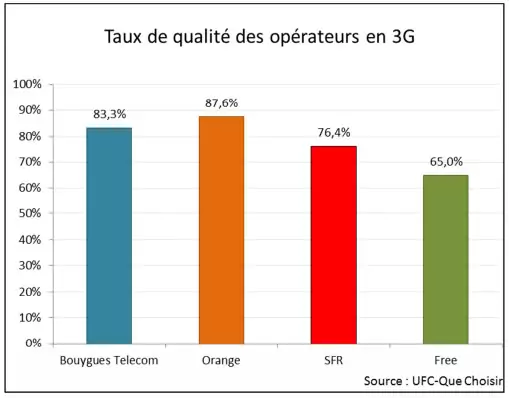 En retenant un critère de temps de 60 secondes pour réaliser le téléchargement d’un fichier de 5 Mo, l’UFC-Que Chosir metr constate des différences de performances relativement peu marquées. Les réseaux de Bouygues Telecom et d’Orange se démarquent en étant les seuls à permettre le téléchargement du fichier en moins de 60 secondes dans plus de 9 cas sur 10. SFR et Free Mobile sont en-dessous de ce seuil et nous remarquons une performance identique sur le réseau propre de Free et sur l’itinérance.