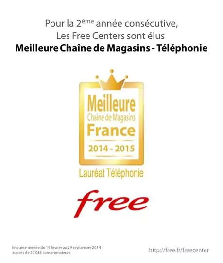 Les Free Centers viennent d’annoncer qu’ils ont été élus « Meilleure Chaîne de magasins- Téléphonie ». Cette prix est attribué à la chaîne de boutiques de Free pour la deuxième année consécutive. Il a été décerné après une enquête réalisée auprès de 27 085 consommateurs entre le 15 février et le 29 septembre 2014.