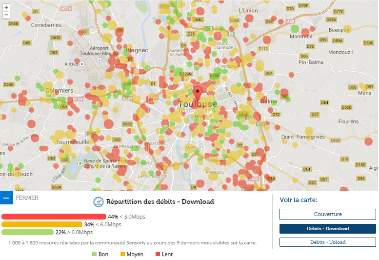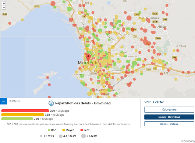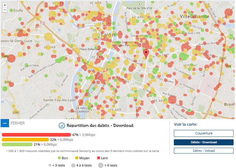- SFR atteint 47 % du territoire lyonnais testé au dessus de 6 Mbits et 20 % en dessous de 3 Mbits.