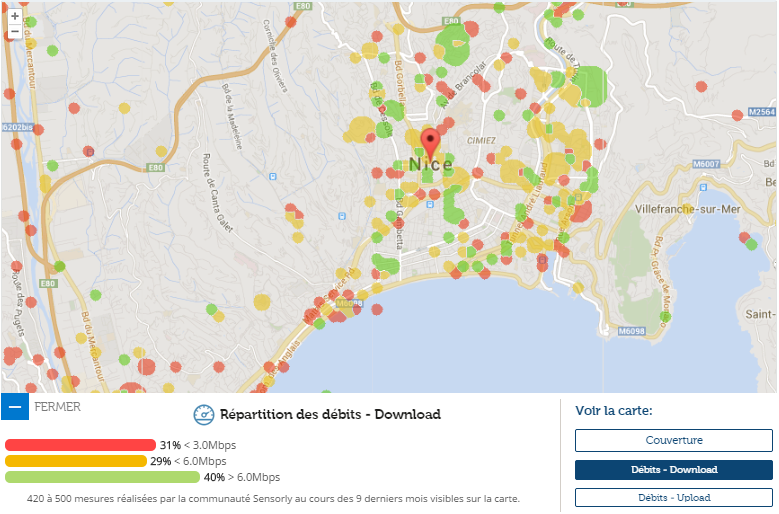 - Bouygues affiche à Nice sa meilleure performance en 2G/3G sur les 5 villes avec 41 % du territoire testé avec des débits supérieurs à 6Mbits contre 35 % avec des débits inférieurs à 3Mbits.