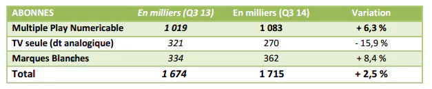 Ce recul est largement compensé par le recrutement de 21 000 abonnés supplémentaires à l’offre multiple-play de Numericable. Au troisième trimestre 2014, le parc multiple-play de Numericable atteint 1,083 millions d’abonnés.