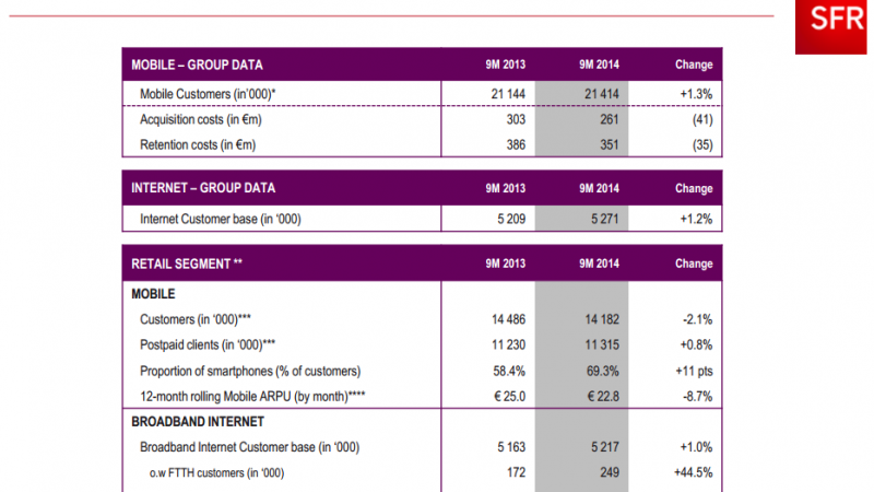 Il faudra attendre quelques jours pour que ces résultats, surtout concernant le chiffre d’affaires de SFR soient audités et officiels. Néanmoins, selon ces données provisoires, le revenu par abonné sur le fixe et sur le mobile se retrouveraient en baissé à 22,8 € sur le mobile et 32,2 € sur le fixe.