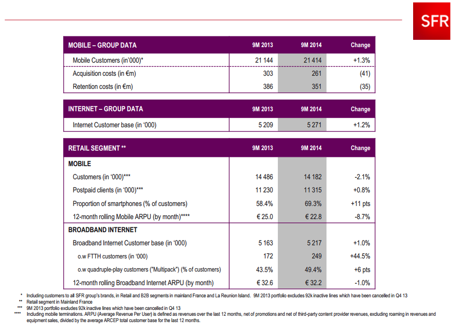 Pour le 3e trimestre 2014, sur le mobile, si SFR réussi à justifier de 35 000 clients supplémentaires nets de résiliation, c’est surtout grâce aux recrutements réalisés par les MVNO, les offres entreprises et ses recrutements en Outre-Mer.