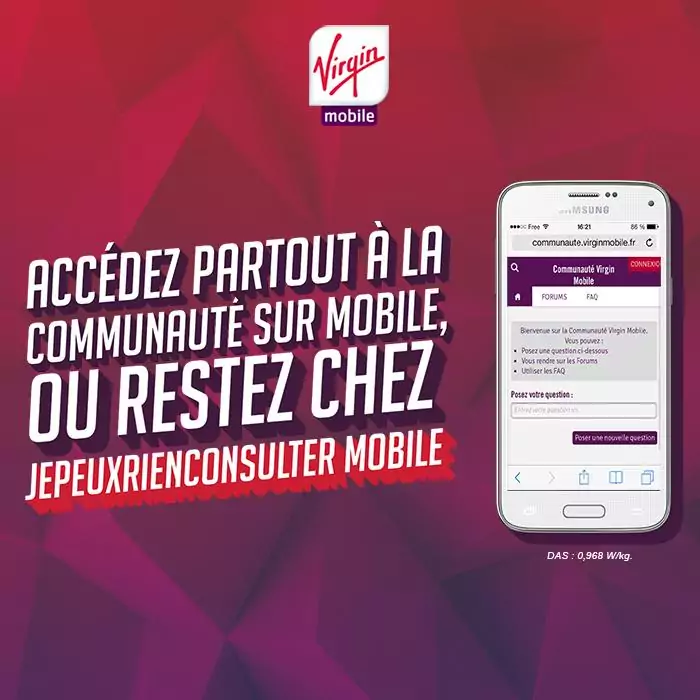 Virgin vient de lancer une nouvelle publicité sur le web, pour communiquer sur l’accessibilité de son forum communautaire. « Accéder partout à la communauté sur mobile, ou restez chez jepeuxrienconsulter mobile » est-il indiqué sur cette pub. Mais visiblement, ceux qui ont réalisé cette infographie sont déjà partis chez Free Mobile. En effet, comme l’a remarqué @Constant1L, le Samsung qui apparaît montre qu’il est connecté au réseau Free Mobile. Un joli fail de Virgin Mobile…