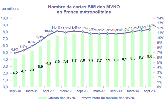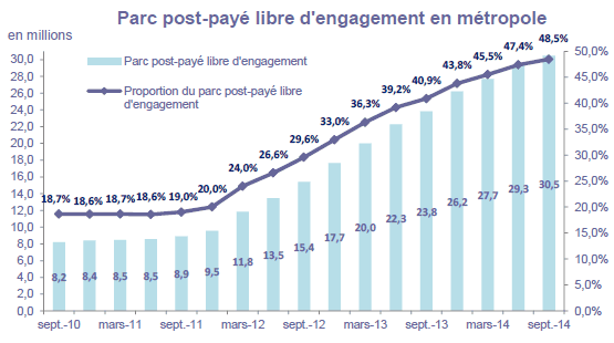 Au 30 septembre 2014, le nombre de cartes SIM en service atteint 79,3 millions, ce qui représente un taux de pénétration de 120,5% de la population, en croissance de 5 points en un an. L’ARCEP note que la dynamique du marché mobile demeure vive : la croissance annuelle du nombre de cartes s’élève à 3,7 millions par rapport à septembre 2013 (+4,9% en un an). Elle est portée par l’augmentation du nombre de forfaits voix et voix-data (+3,2 millions en un an dont +715 000 au cours du troisième trimestre 2014) et du nombre de cartes MtoM (+1,4 million en un an, +315 000 sur ce trimestre). Le nombre de cartes prépayées est toujours en repli mais moindre que les trimestres précédents (-900 000 cartes en un an, dont -50 000 au cours du trimestre).