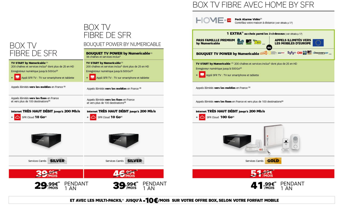 C’est donc une troisième offre qui sera proposée par SFR et qui comprendra l’offre TV Start By Numericable avec 200 chaînes dont 25 en HD, un enregistreur numérique jusqu’à 500 Go, l’application SFR TV, les appels illimités vers les mobiles en France et vers les fixes en France et plus de 100 destinations, l’internet Très Haut Débit jusqu’à 200 Mbits et 10 Go de Cloud SFR.