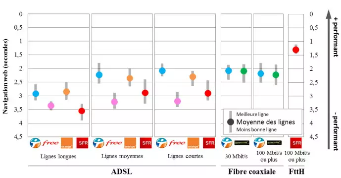 Cet indicateur mesure le temps de chargement d’une page web tel qu’il serait ressenti par un utilisateur. On constate que affiche la plus mauvaise performance sur les lignes moyennes et longue, et arrive juste devant SFR sur les lignes courtes. A l’inverse, on notera les bonnes performances de Bouygues Télécom sur ce critère.