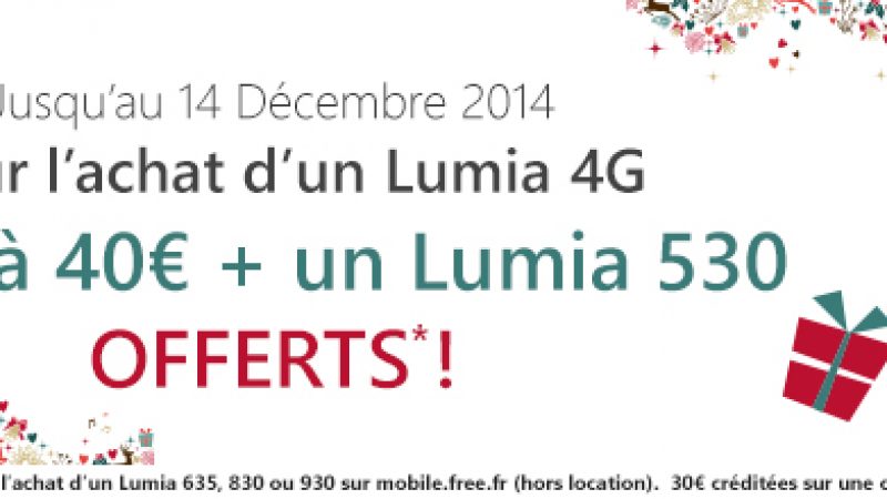 Une nouvelle offre plutôt intéressante vient d’être disponible sur la boutique Free Mobile. En effet, pour fêter Noël, Microsoft vous offre un Lumia 530 pour tout achat d’un Lumia 635, Lumia 735, Lumia 830 ou Lumia 930 effectué entre le 28/11/14 et le 14/12/14